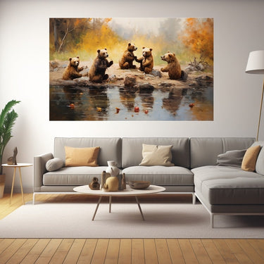 This funny bear family painting is a lively work that captures the playful spirit of these majestic forest dwellers. A moment of elation, where the bears seem to be enjoying the proximity of a river, expressing boundless energy.