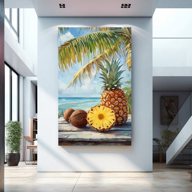 This tropical painting captures the exotic essence of fruit and a heavenly landscape. Golden pineapples and coconuts rest in the foreground, while a sunny beach background with palm trees and azure blue waves completes the lush scene. The piece offers a visual journey into a tropical environment, bringing warmth and escape to your living space.