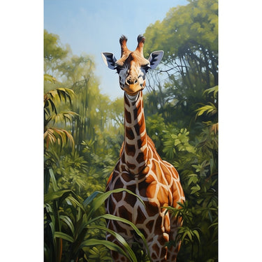 This colorful giraffe painting leaves captivates the eye with vibrant energy. At the centre of the composition, a majestic giraffe rises with exceptional grace.