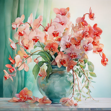 This red orchid painting features a bouquet of the famous flower in a turquoise vase, for a soothing immersion. A choice decoration for a peaceful interior!
