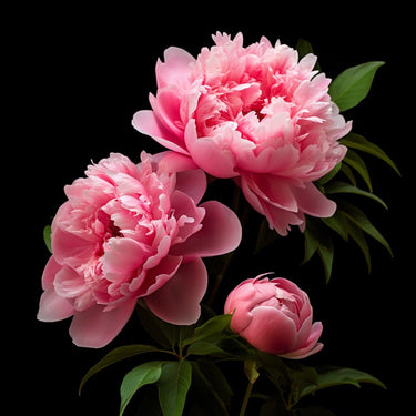 Give charm to your interior decoration with this peony painting print. The beauty of these flowers with their delicate petals on a deep black background will bring harmony to your ornament.
