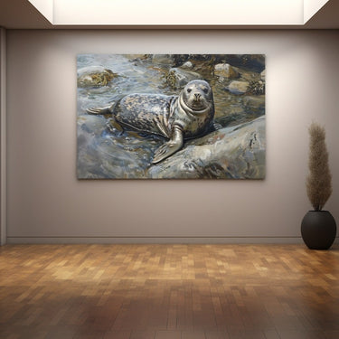 In this painting, the grace and elegance of the seal are showcased in an extraordinary picture. The mammal is depicted resting on a rocky beach, its smooth, curving silhouette evoking a harmony with its marine environment.
