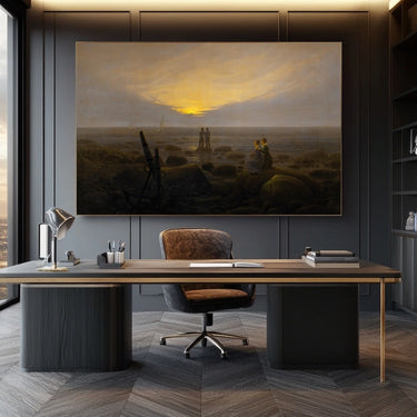 Rediscover the melancholy and poetry of Romanticism with this reproduction of Moonrise at the Sea by Caspar David Friedrich. This timeless masterpiece depicts a serene scene where the moon, emerging over the sea, softly illuminates the sky and the peaceful waves. In the foreground, three figures contemplate the majesty of the night landscape, symbolising introspection in the face of nature's immensity. This reproduction faithfully captures the depth and sensitivity of the original work, a tribute to Friedrich's unique style.