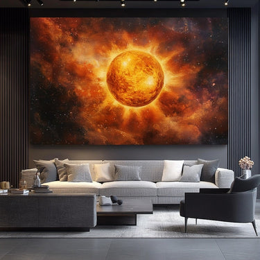 Illuminate your home with this extraordinary work of art depicting the Sun. This painting combines artistic creativity and astronomical fascination to create a truly remarkable piece. The warm tones of the Sun contrast with the dark background creating an atmosphere that is both dynamic and serene.