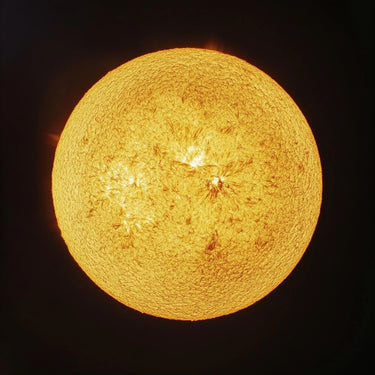 Discover the power and majesty of the sun with this painting, where the shining star stands out clearly against a deep black background. The brilliant details of the sun's surface, with its golden hues and luminous flashes, contrast beautifully with the dark background, creating a work that is both minimalist and impressive.