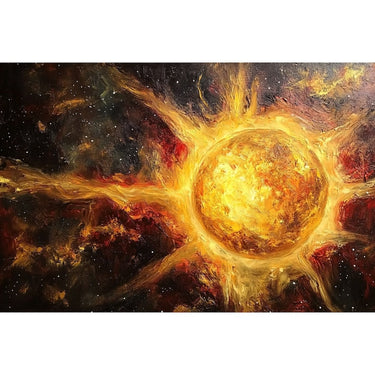 Plunge into the immensity of the universe with this exceptional painting of the Sun as seen from space, featuring its majestic rays. This work of art highlights the power and beauty of our star, projecting its light across the void of space. The composition invites the viewer to feel as if they are floating in space, directly observing the star.