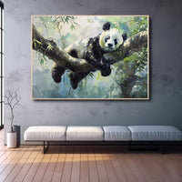In this acrylic panda painting, tranquillity and gentleness mingle in a captivating scene of wildlife. On a canvas where shades of green and brown blend harmoniously, a panda lounging on a tree branch emerges as a peaceful vision of nature.