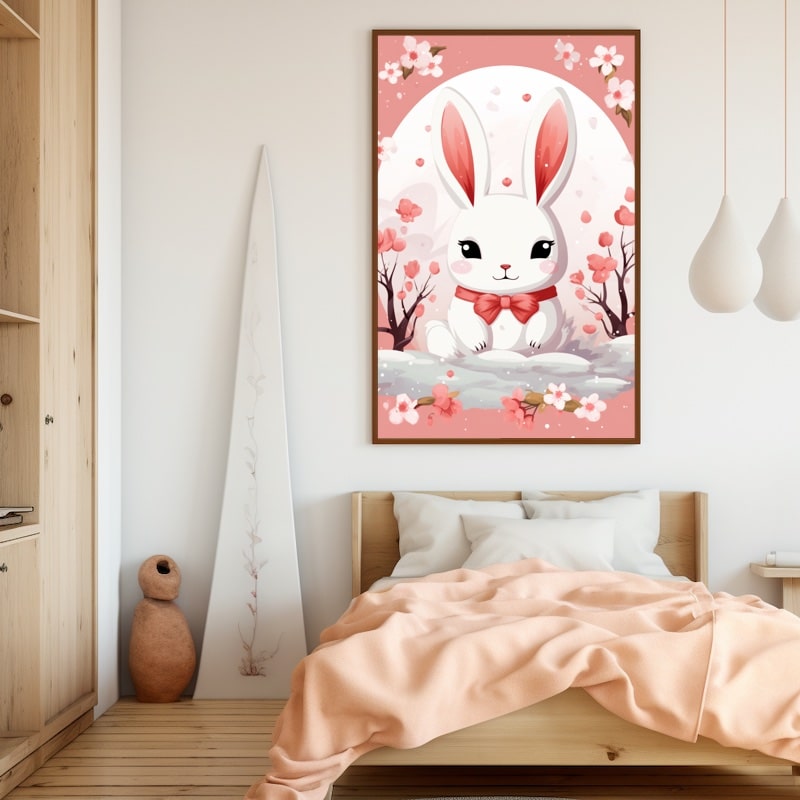 This cute rabbit painting features the mammal on a cloud, as if in a deep dream. Between cherry blossom and delicate pink, it's sure to enchant the female gender.