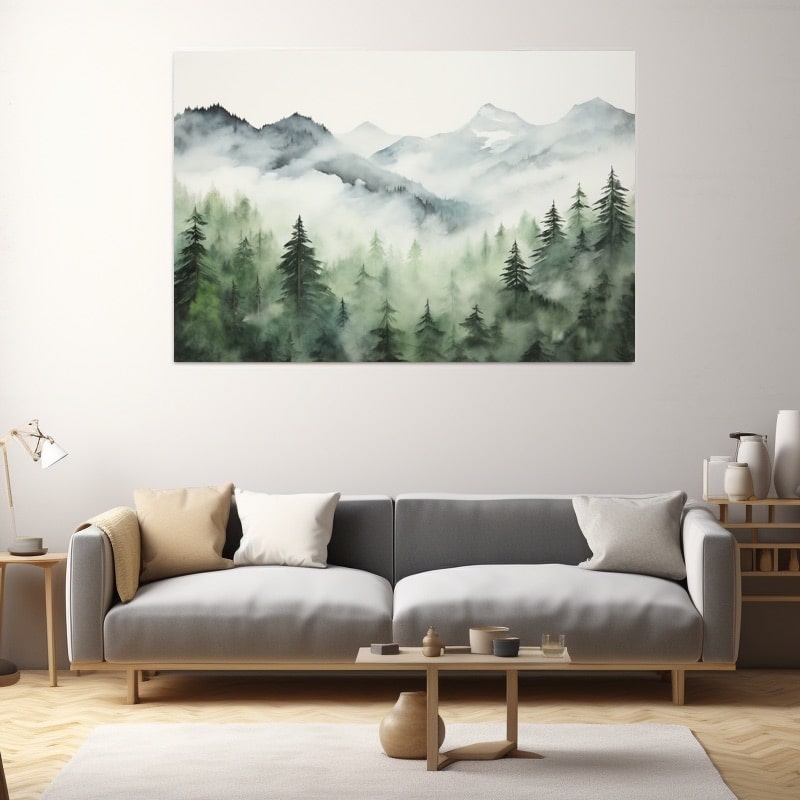 Decorate your room with taste and character, by displaying the mountain painting watercolor. This work featuring mountains and forests in a watercolour style, is sure to offer a mountain touch to your room.