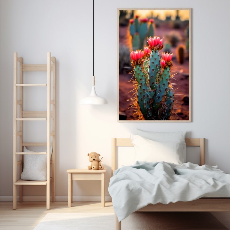 This flowering cactus painting is an illustration of the prickly pear's natural beauty. Its prickly snowshoes contrast with its delicate flower.