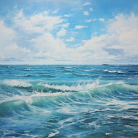 In this sumptuous oil painting, the artist captures the majesty and infinite beauty of the sea. Subtle shades of blue, turquoise and green blend harmoniously to evoke the changing depths of the ocean. The rich, undulating texture of the paint creates a sense of movement, as if the waves were dancing in the wind.