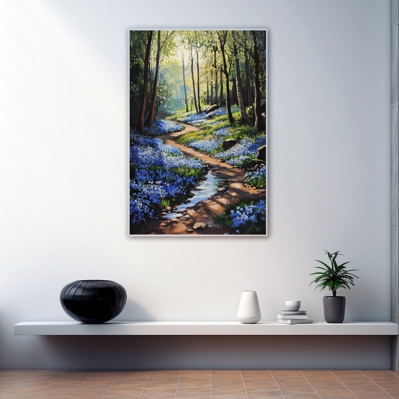 This charming painting transports you to the heart of a spring undergrowth full of life and colour. A winding path winds through the trees, inviting the eye to lose itself in the depth of the painting. Perfect for creating a soothing focal point in a living room or bedroom, it will instantly transport you away from the hustle and bustle of everyday life.