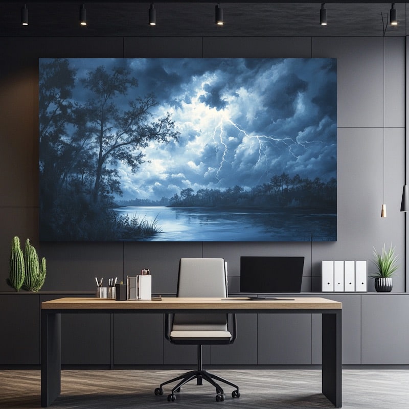This painting reveals a mysterious landscape where the violence of an impending storm mingles with the wild beauty of nature. In a palette of deep, dark tones, the artist has masterfully depicted a tumultuous river winding through towering trees, while ominous clouds laden with electricity overhang the painting. Perfect for lovers of atmospheric paintings, this work will bring a contemplative dimension and emotional depth to your interior space.