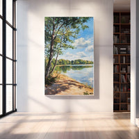 Evade into the cool of a summer afternoon with this summer holiday painting, a work that evokes the calm and charm of a relaxing moment by the water. This evocative work invites you to share a quiet moment, as if you were sitting under the tree, contemplating the peaceful beauty of the lake in summer.