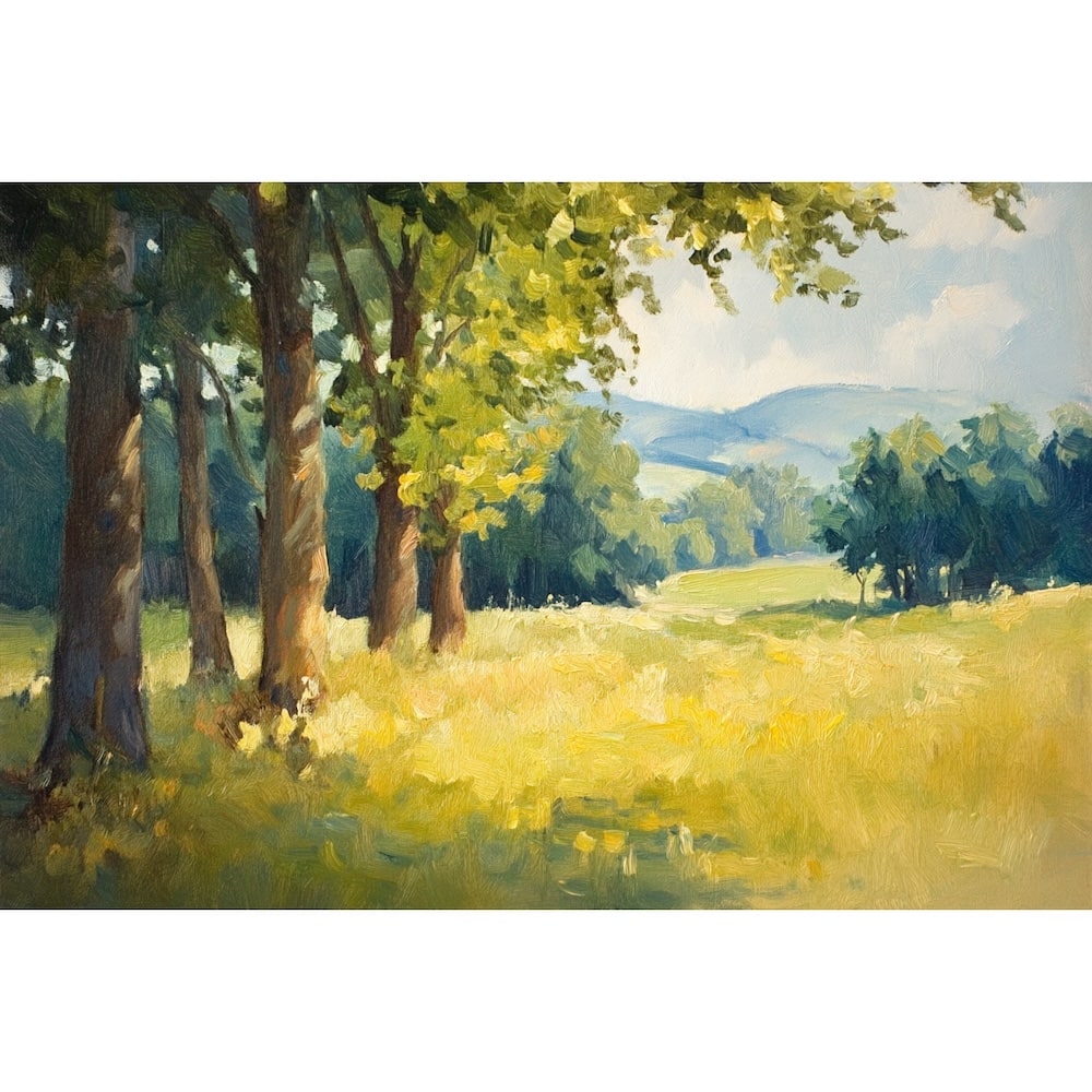 Plunge into the splendour of summer nature with our summer landscape painting, a work that captures the perfect harmony between the majesty of trees and the softness of a flowering meadow. This striking masterpiece offers a panoramic view of an idyllic summer landscape, where tall majestic trees stand alongside a lush meadow.