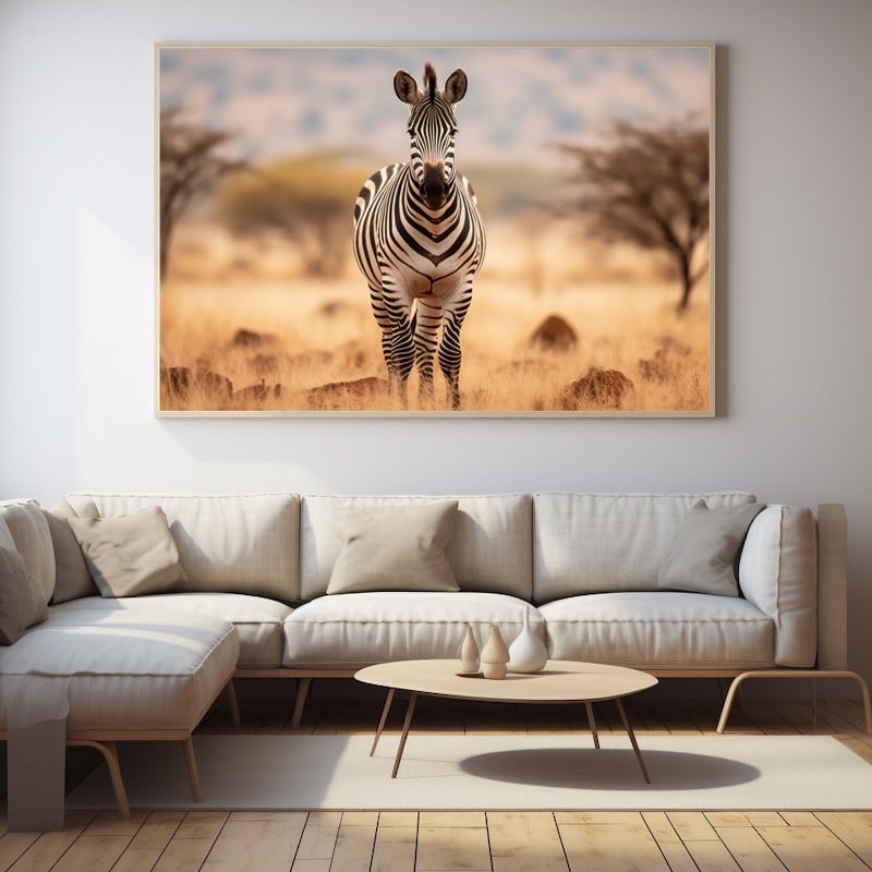 Offer a new dimension to your home with the zebra print on canvas in the heart of the savannah. It offers an out-of-the-ordinary representation of the equine with the striped coat.